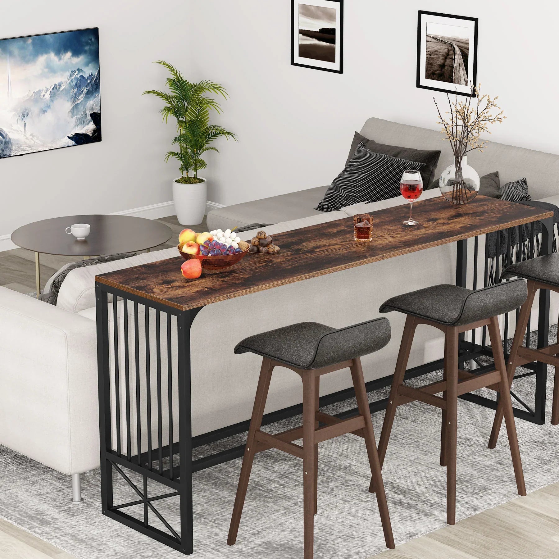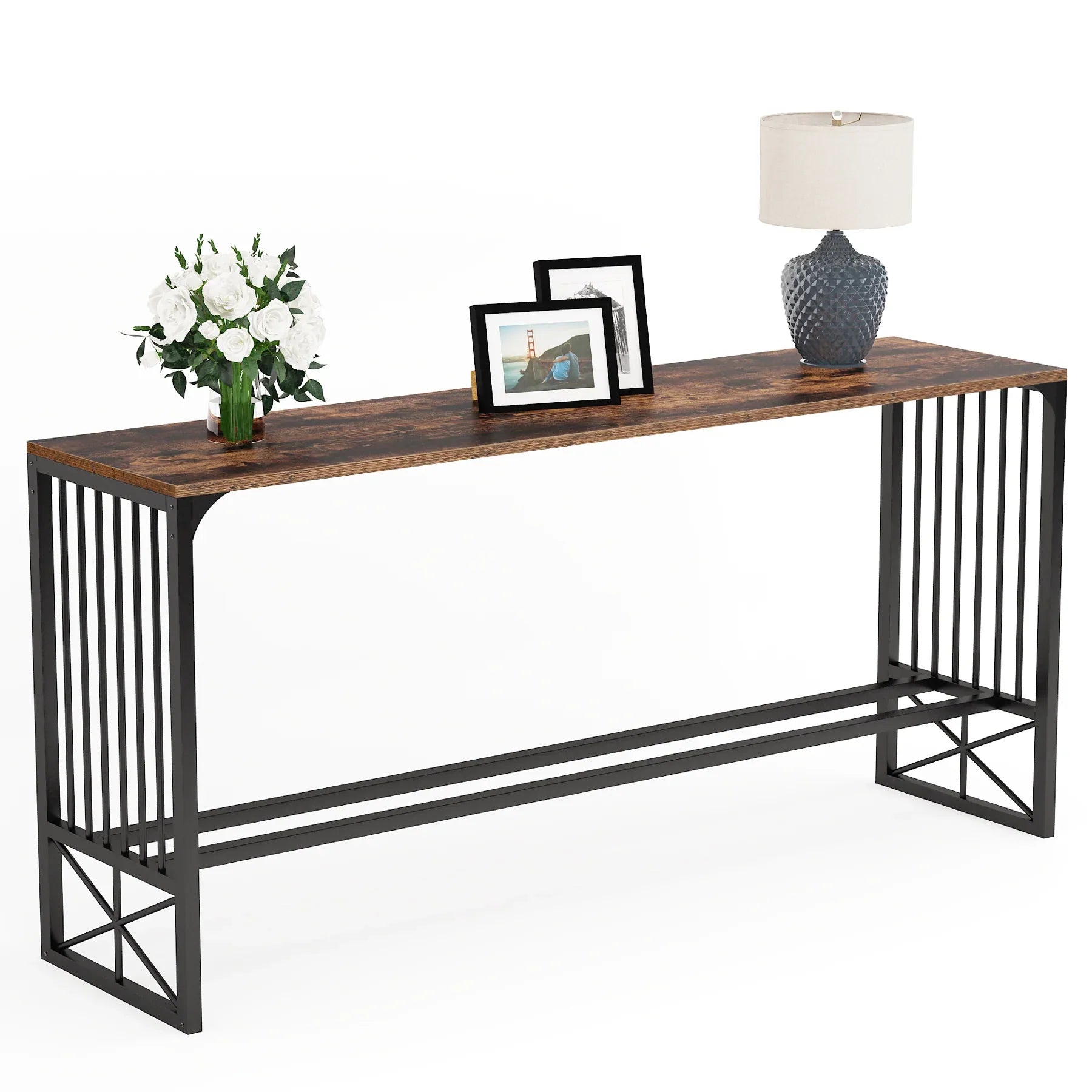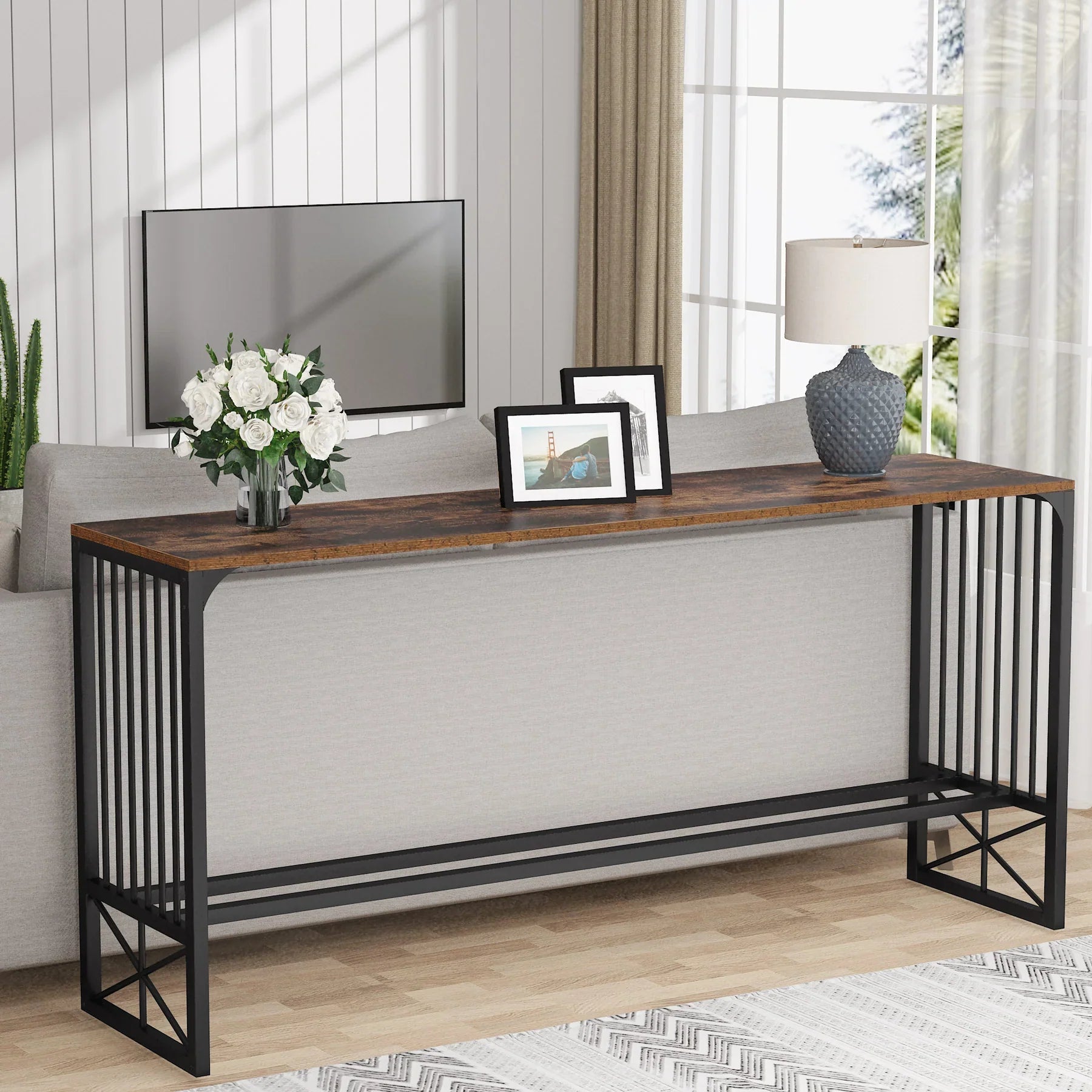 Narrow Long Sofa Console Table -Bring function to your living room or entryway without occupying too much space with this rustic-style skinny long sofa table. It sits nicely behind large sectional sofa/couch, entrance, and an empty hall, turning a spare space into a decorative display. Or you can place it against the wall as a pub table.