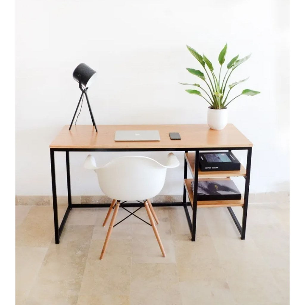 Choose this modern looking desk that has two shelves to store books and files. The office is open to give a sense of spaciousness and more comfort while working or studying.. The desk is made of MDF wood covered with ready-made veneer, and the stands are made of carbon steel Greased electrostatic Than Means power to bear and resistance for moisture and rust and scratches Than makes it elegant always. Choose the Color of the holders that suits you, whether it is white or matte black, to be the most suitable desk for your room