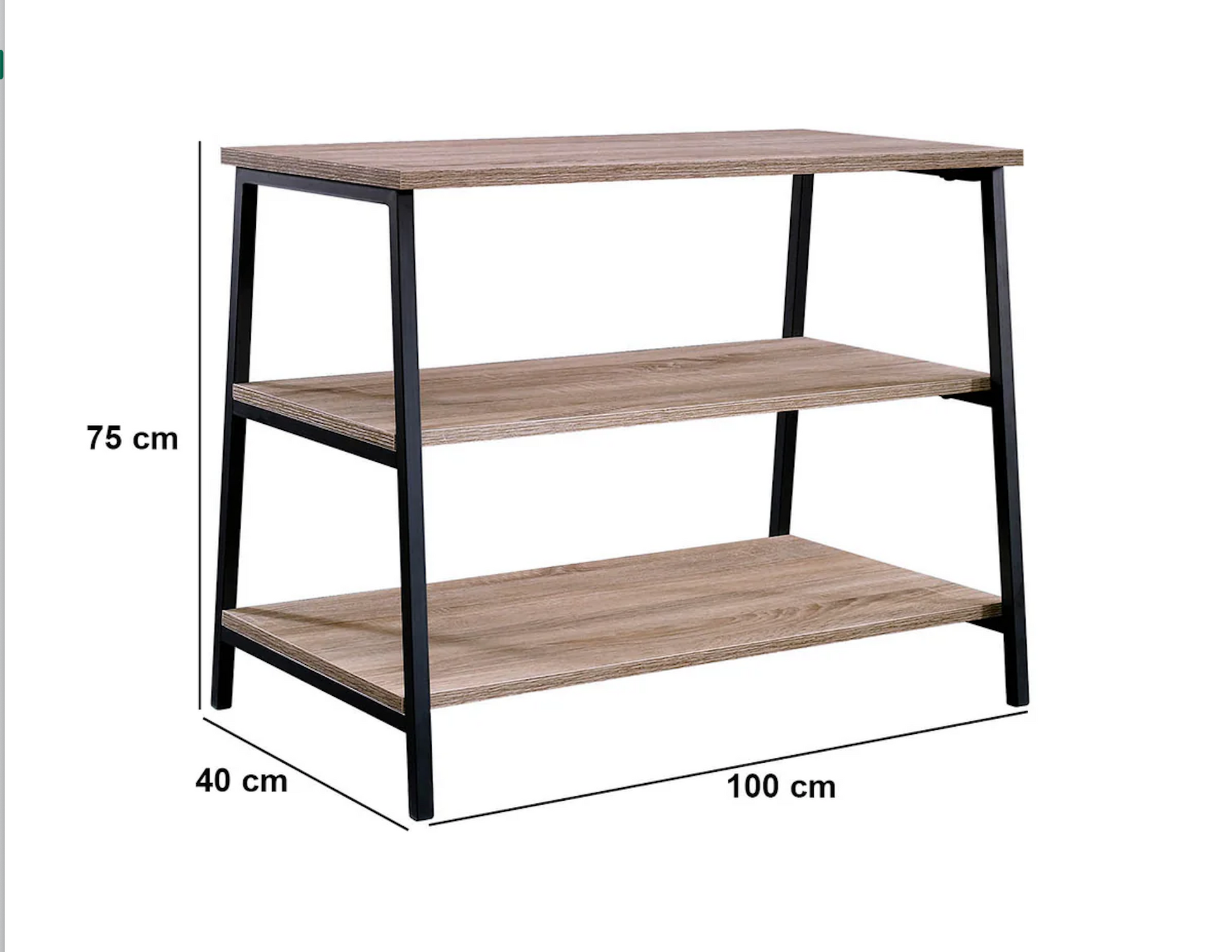 Anchor your entertainment center in rustic, contemporary style with this Artur TV stand for TVs up to 36". Founded on a sturdy metal frame in a black finish, this unit strikes an open rectangular silhouette. Crafted of manufactured wood in a rich charter oak finish/smoked oak finish, two open lower shelves are perfect for displaying the cable box and DVD player, while the top shelf can accommodate TVs up to 36" wide.